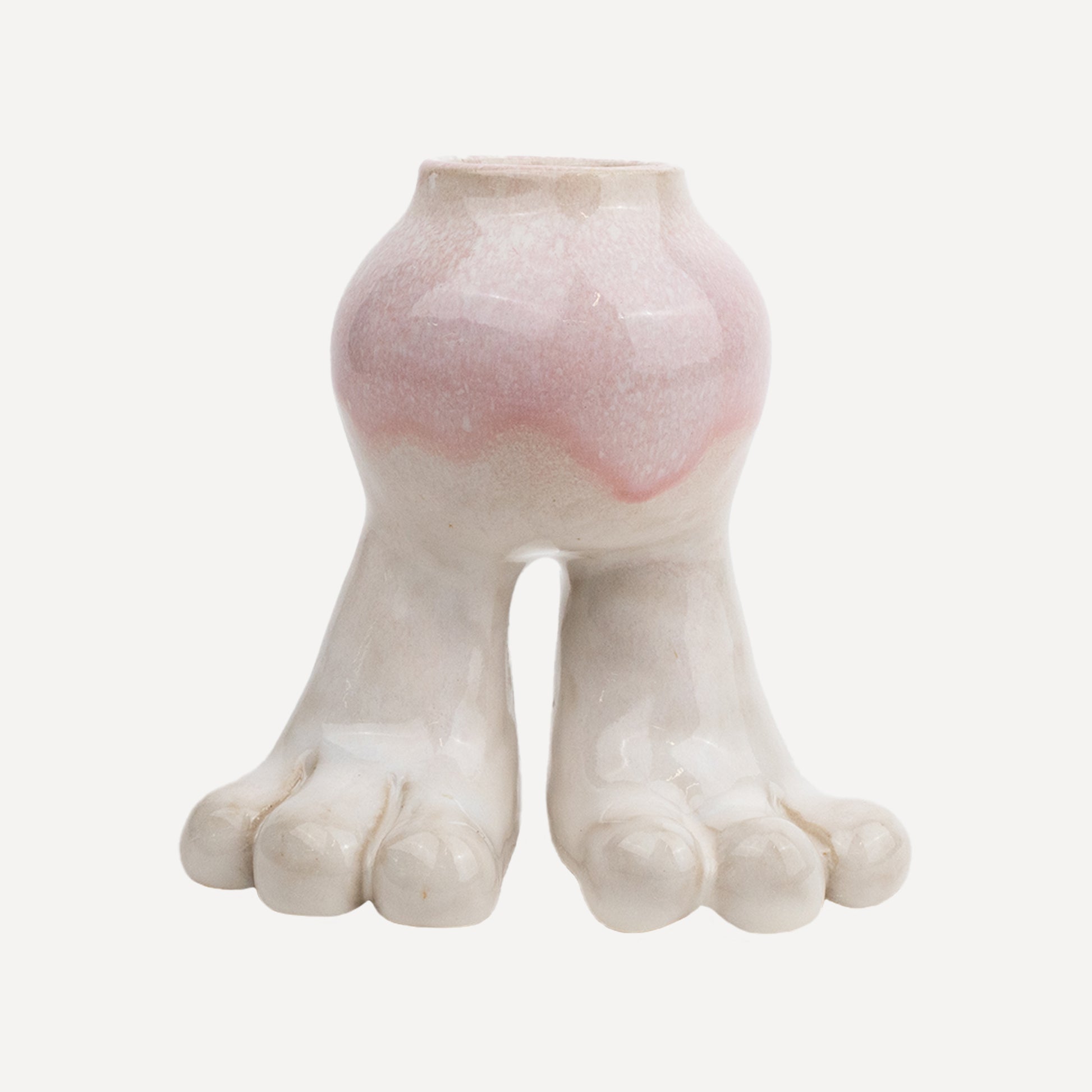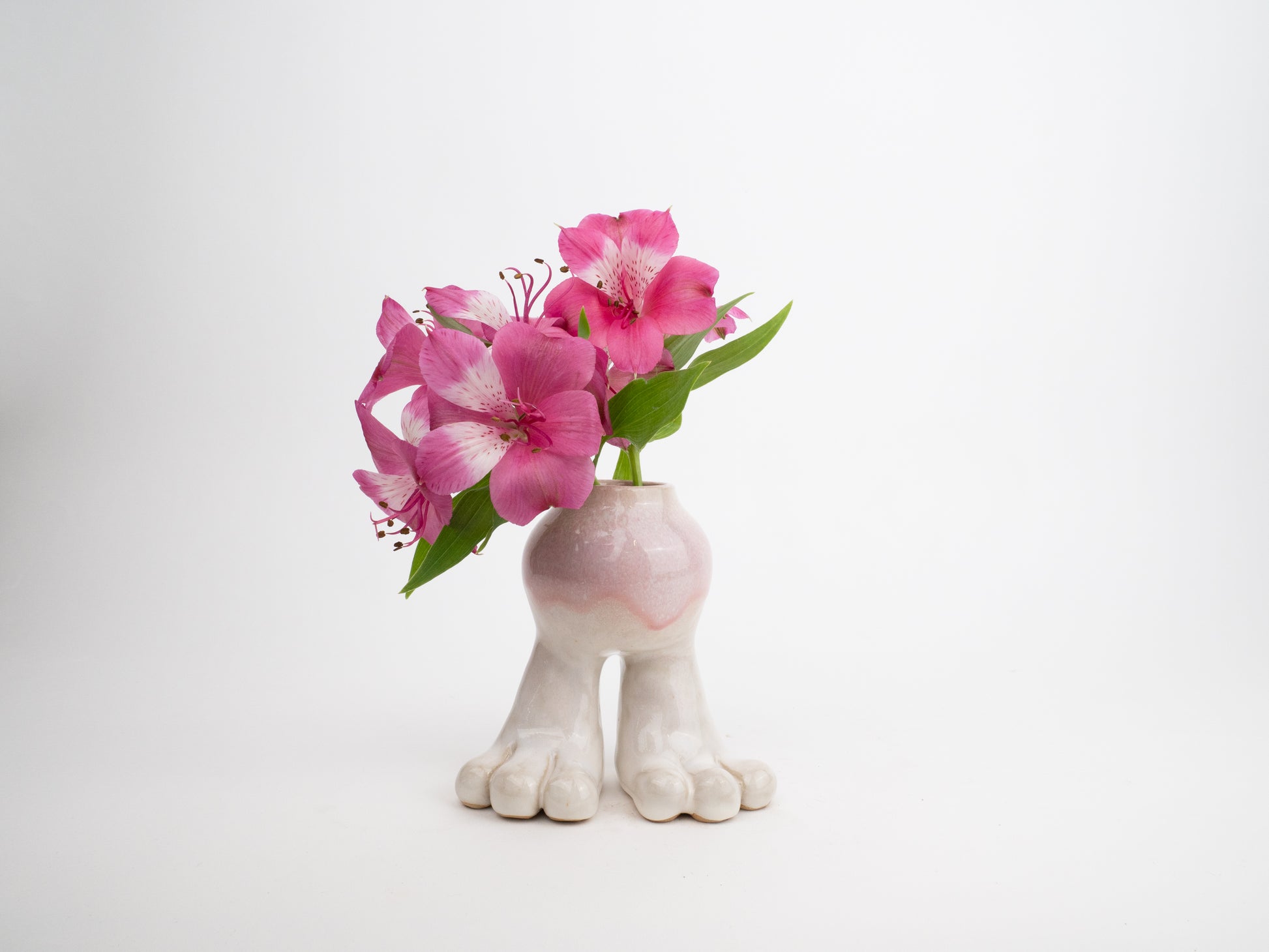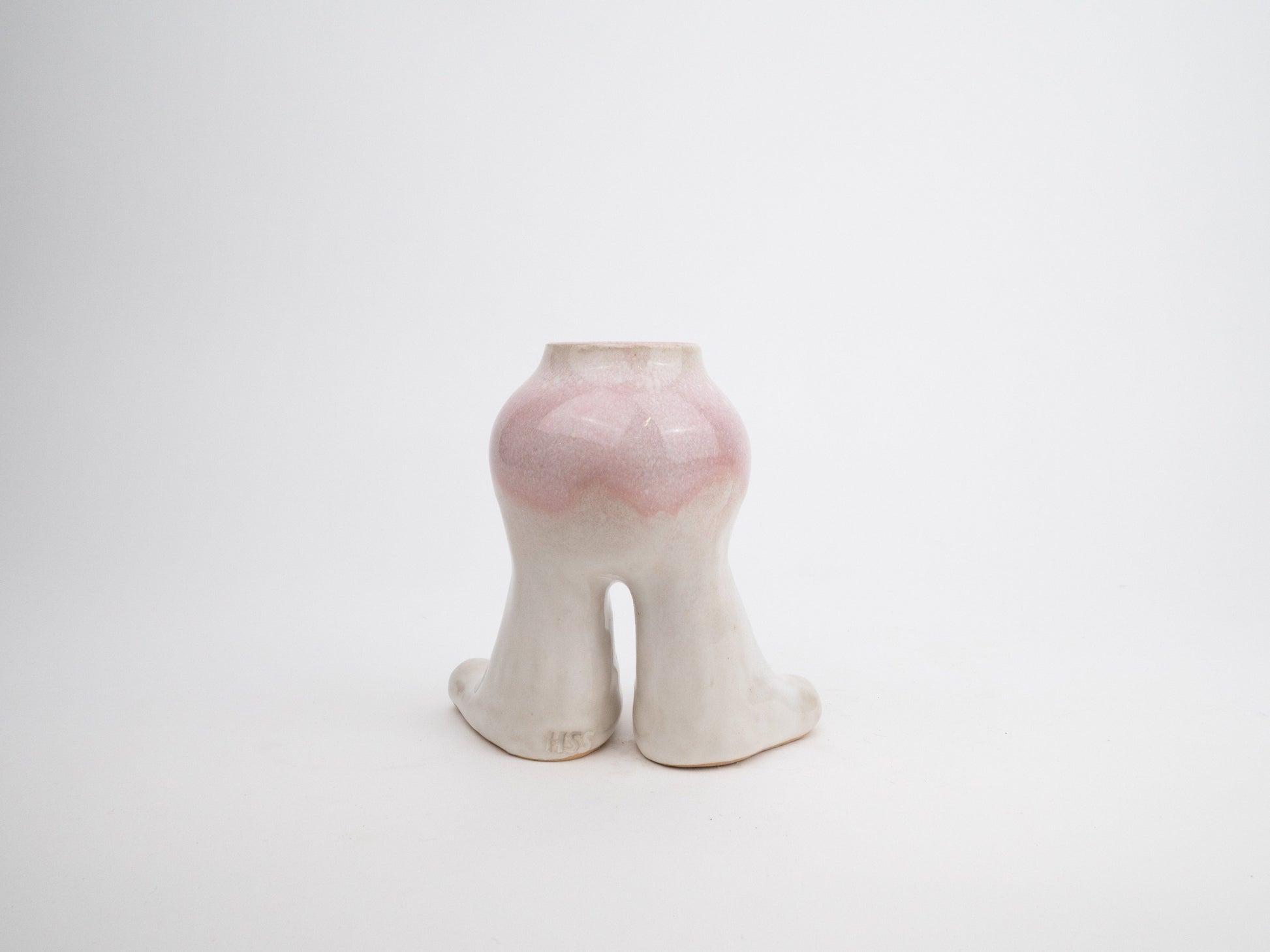 The Tootsie vase series has a thrown vase added to two hand-built legs and feet. The result is a playful and unique form. This Tootsie vase has been decorated in a subtle pink colour.