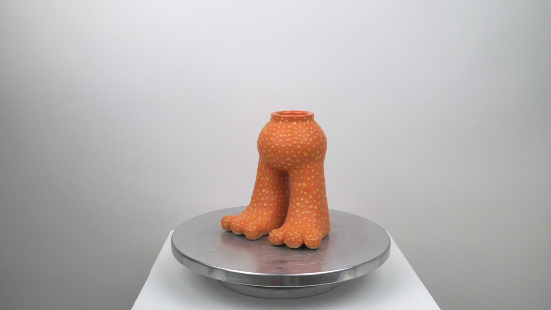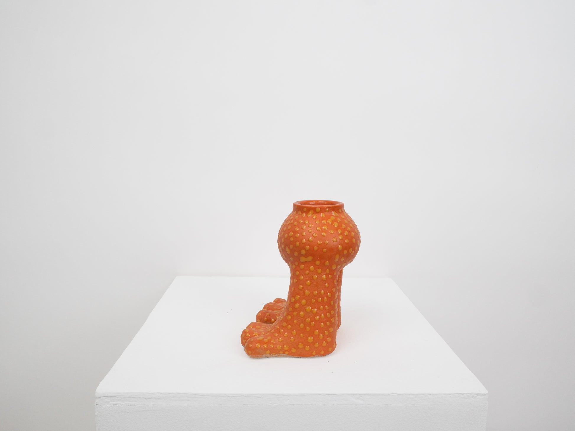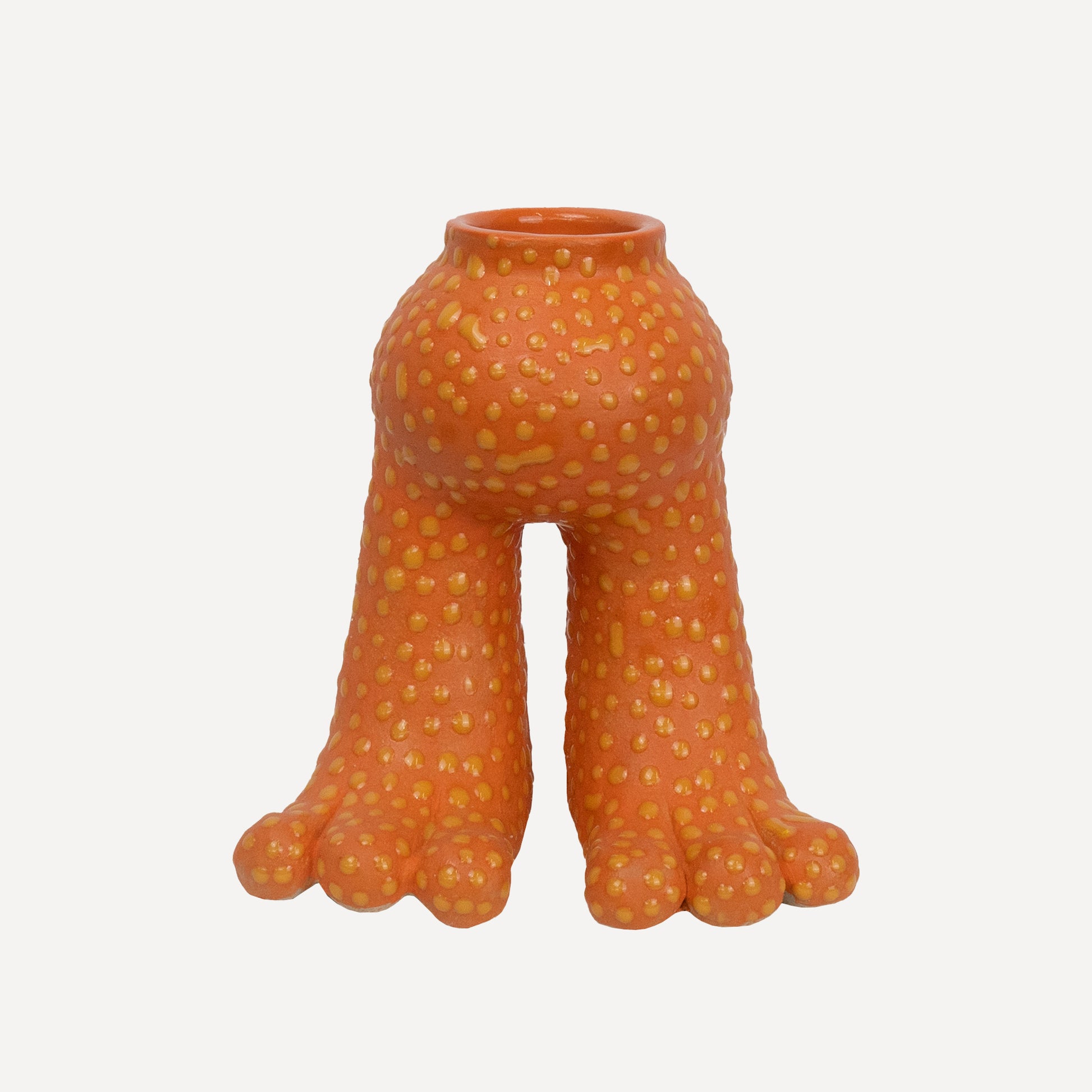 The 'Tootsie' vase series has a thrown vase added to two hand-built legs and feet. The result is a playful and unique form. This 'Tootsie' vase has been decorated with a matte orange base layered with glossy yellow dots.