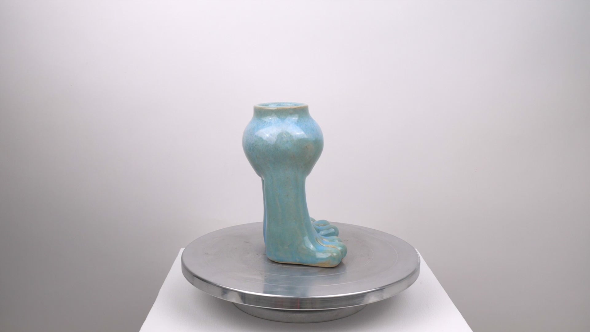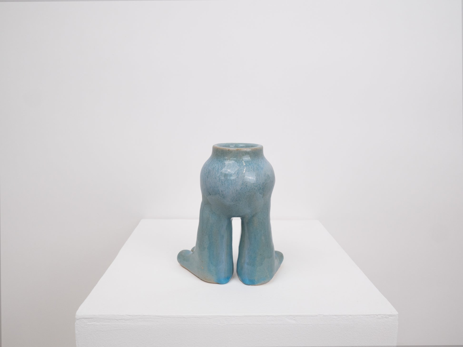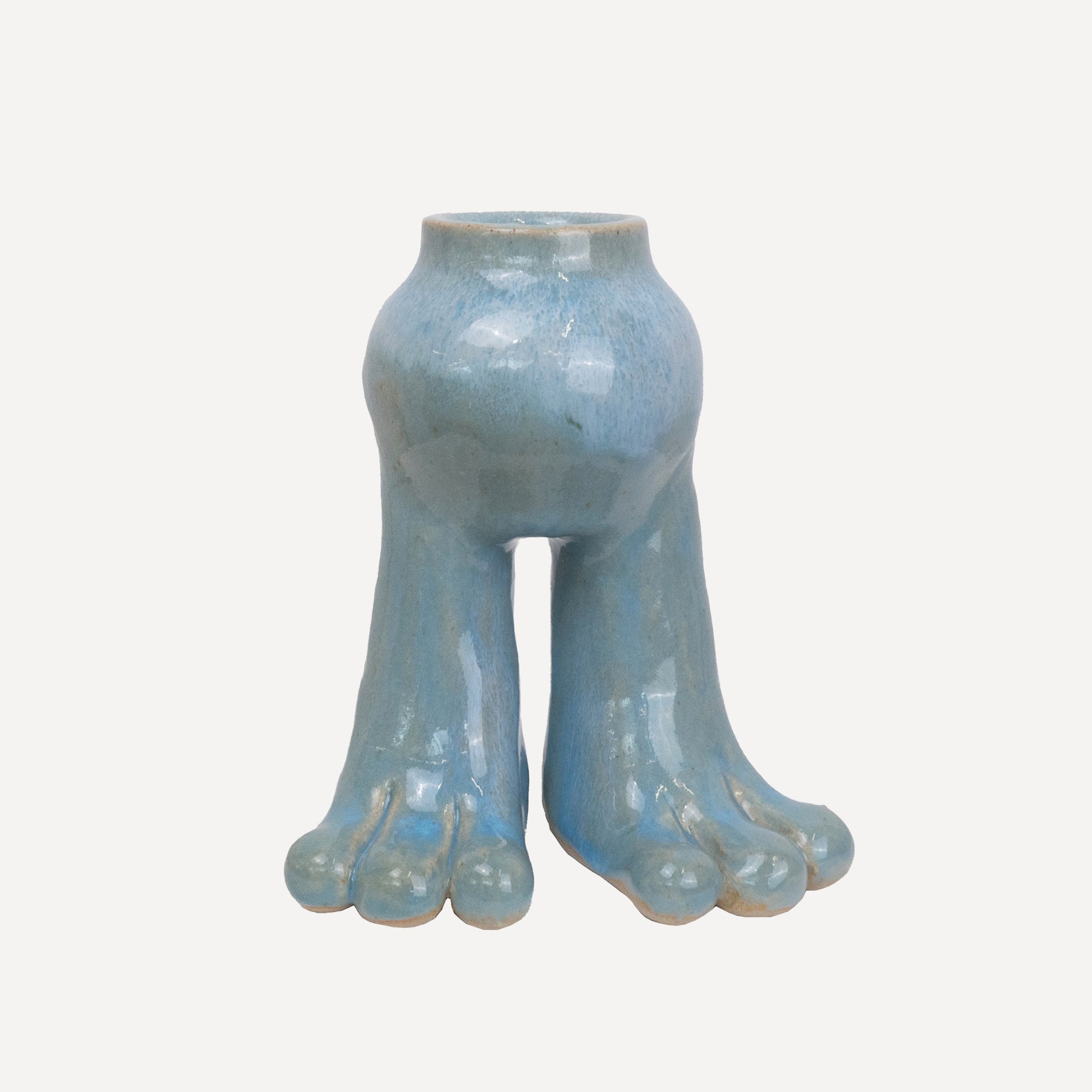 The 'Tootsie' vase series has a thrown vase added to two hand-built legs and feet. The result is a playful and unique form. This 'Tootsie' vase has been decorated by layering glazes to create a hue of light blue and white tones.
