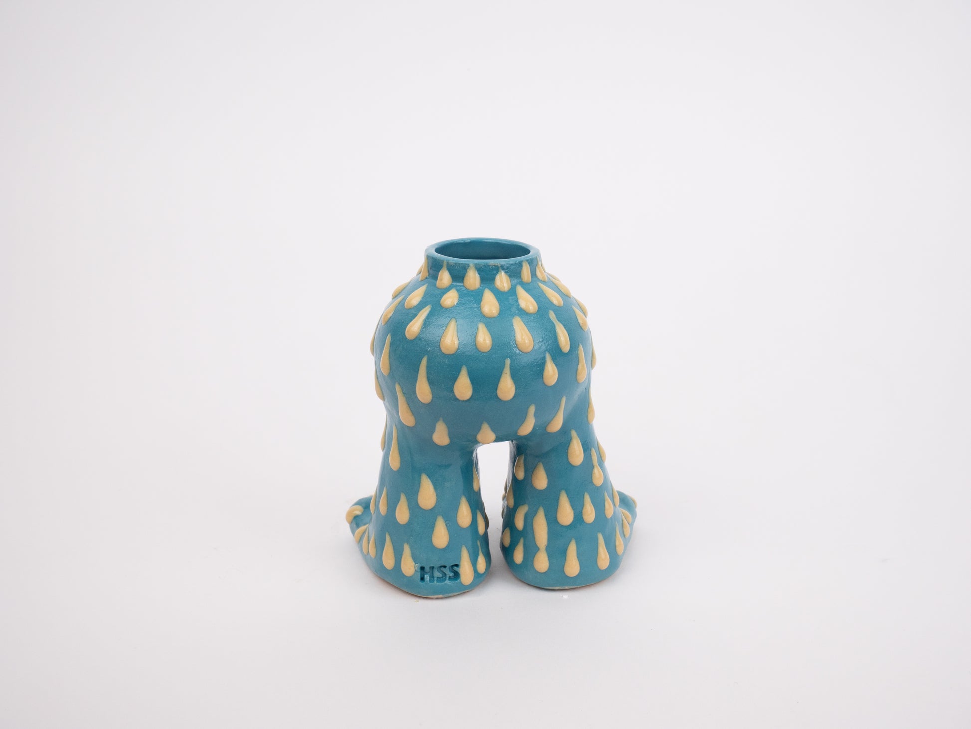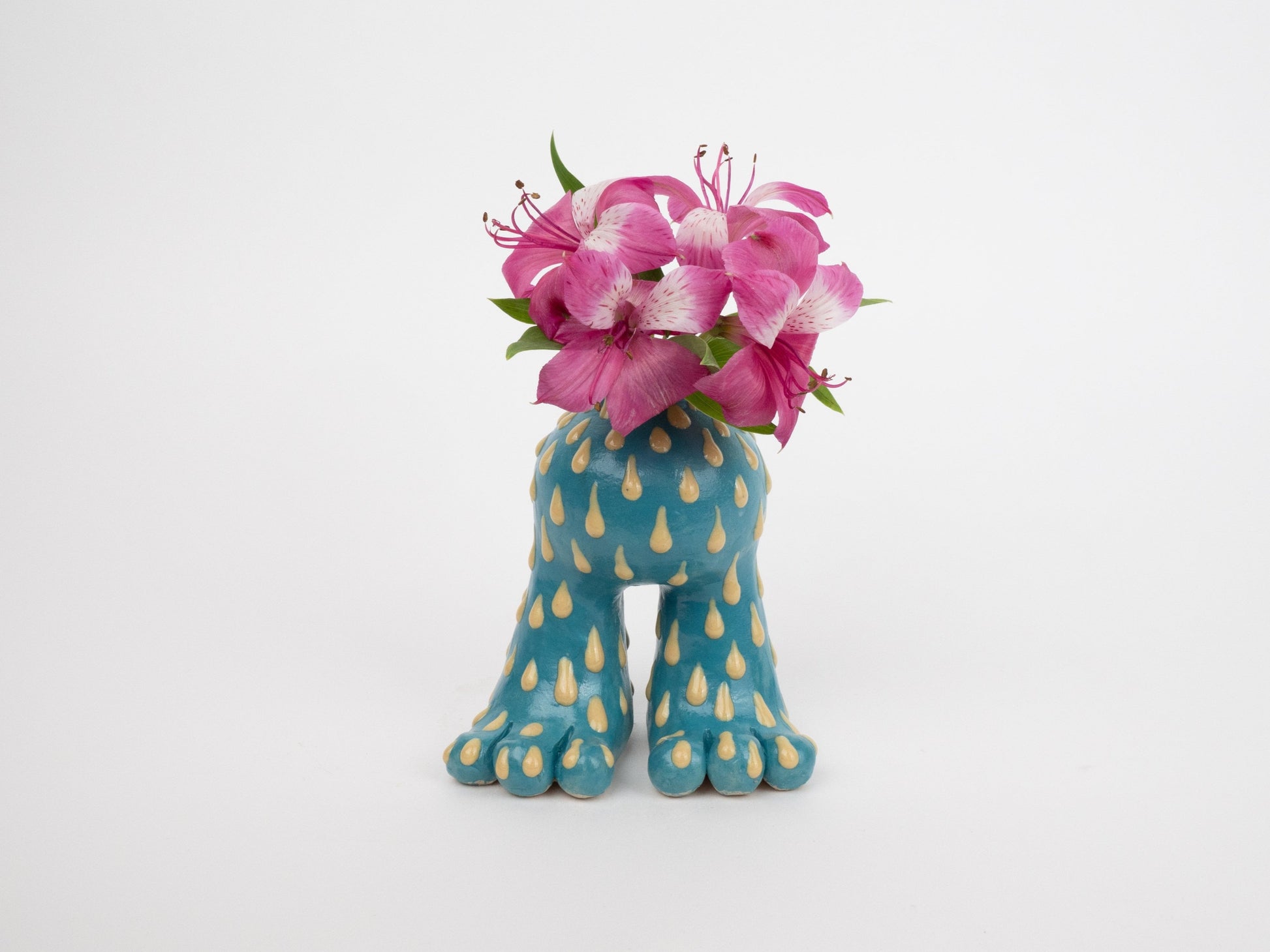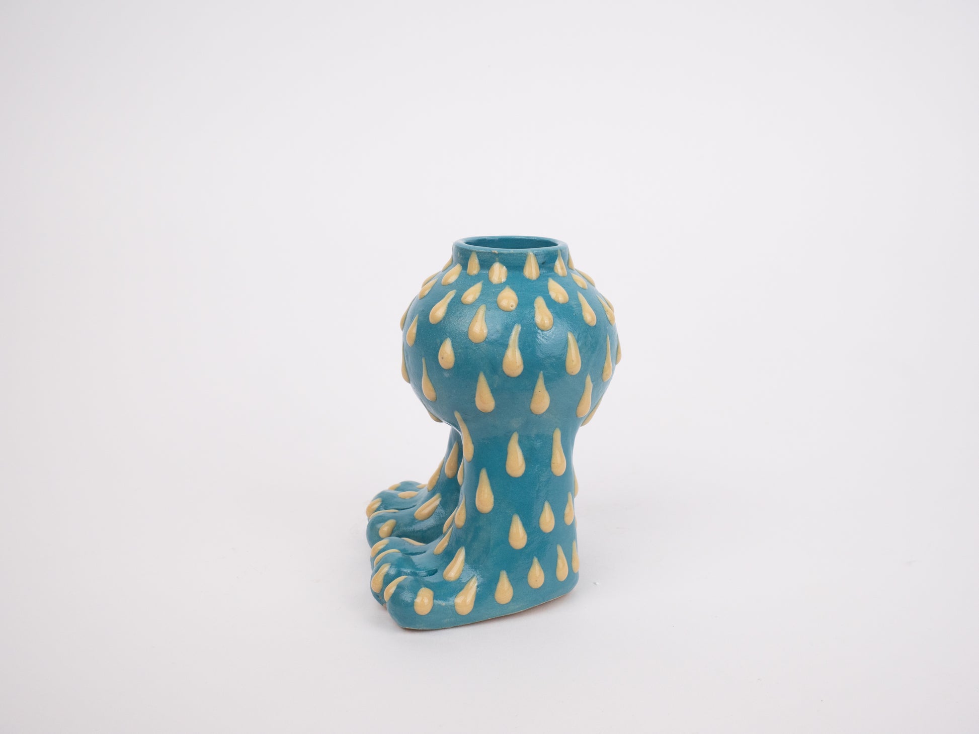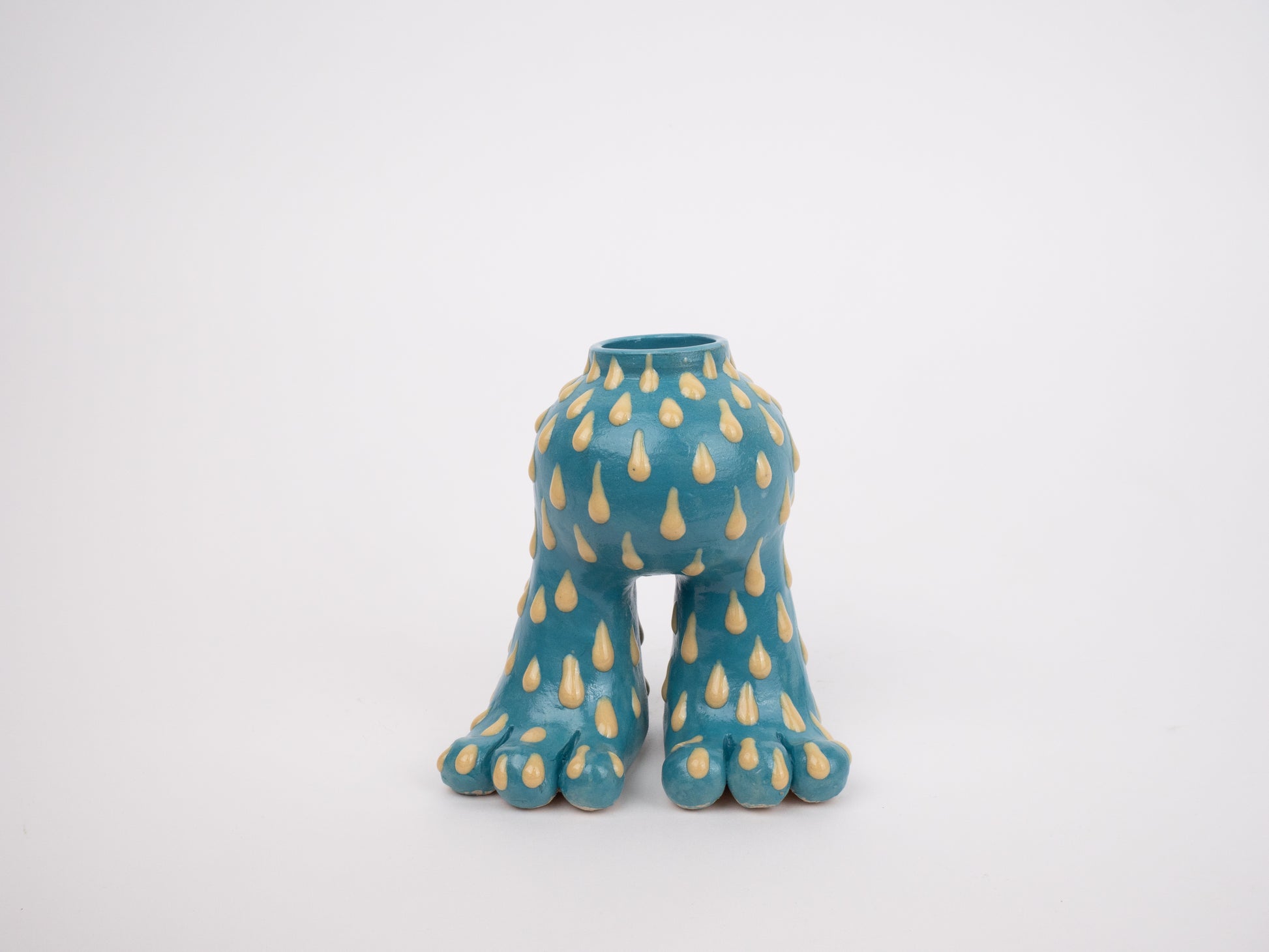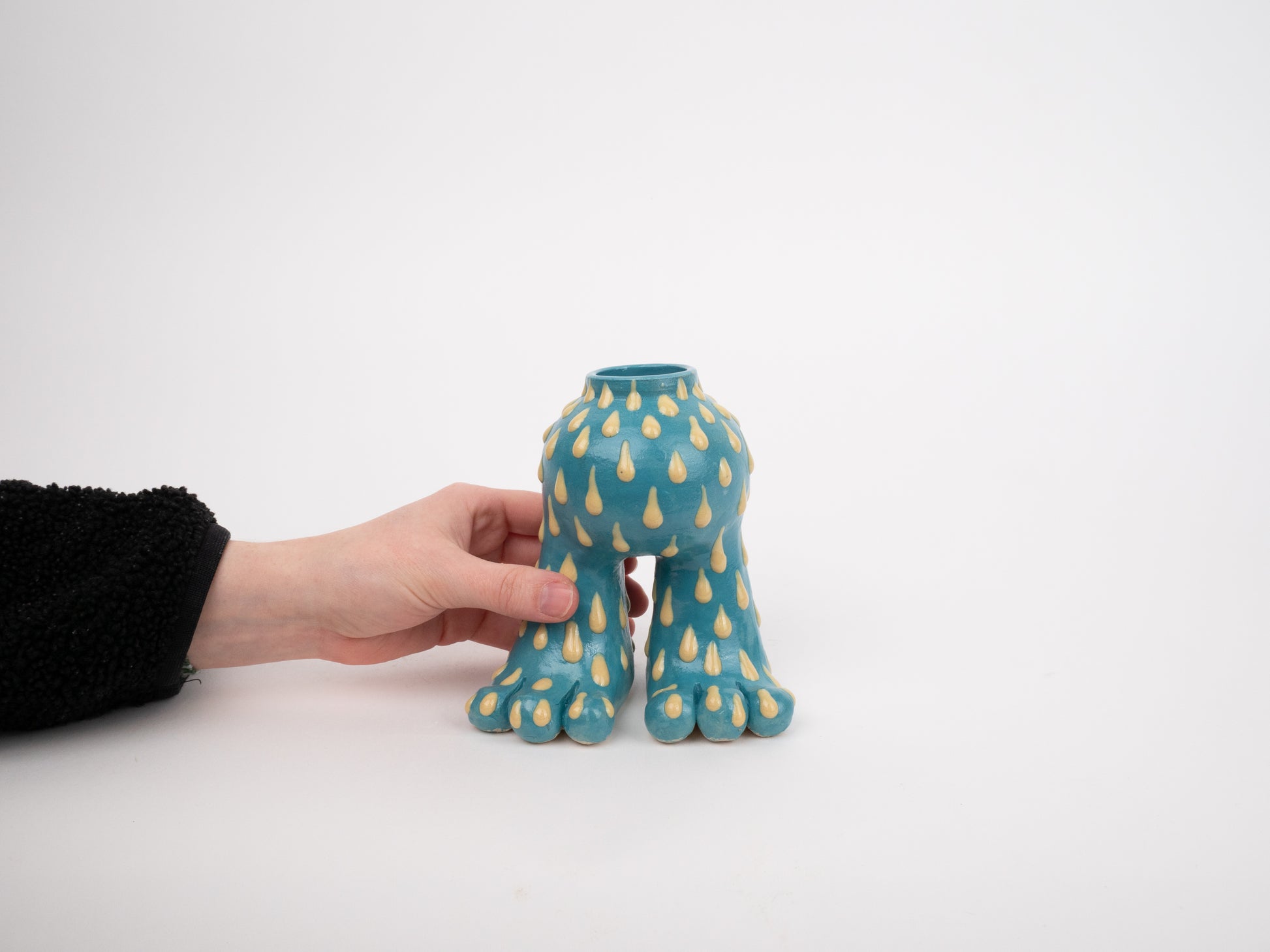 The Tootsie vase series has a thrown vase added to two hand-built legs and feet. The result is a playful and unique form. This Tootsie vase has been decorated in a turquoise glaze and gloopy yellow spots.
