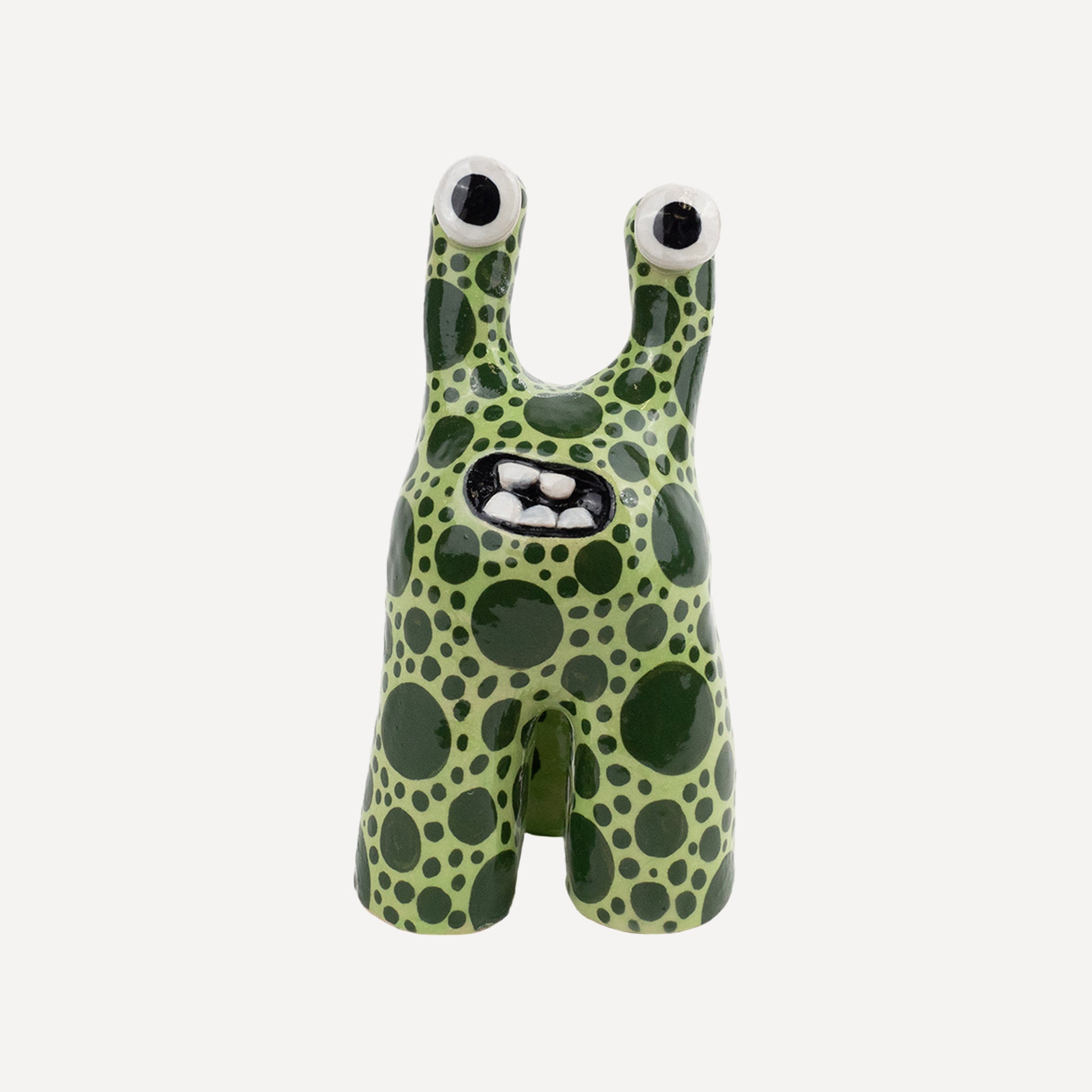 Tully is one of our most classic monster designs. Its humorous and upbeat energy brings joy to any room. This Tully monster has been decorated in a two-tone green polka-dot pattern and finished with a glossy glaze.
