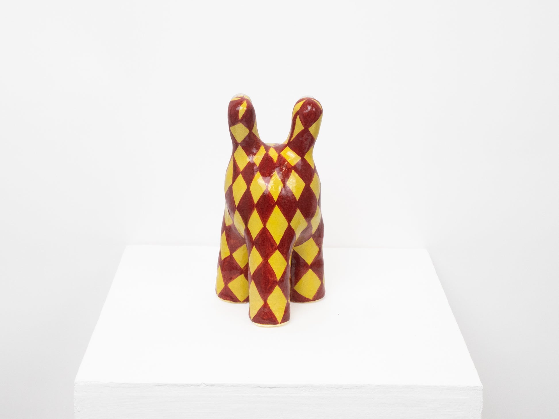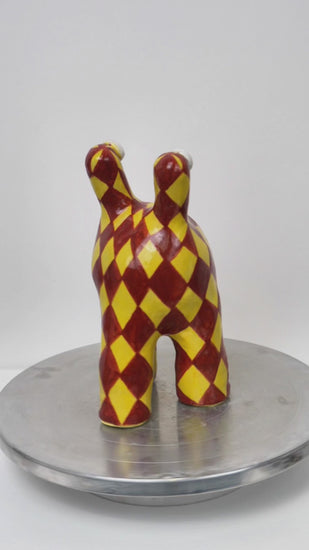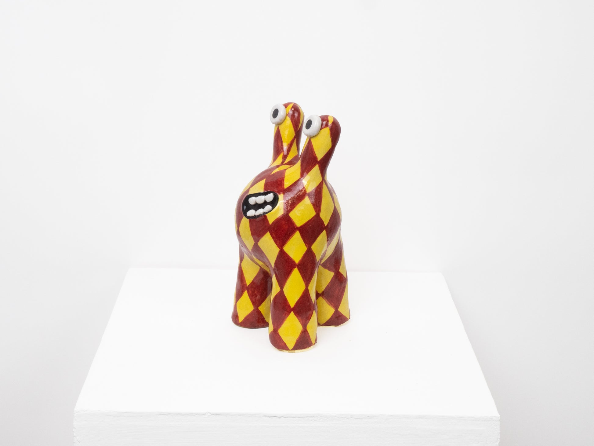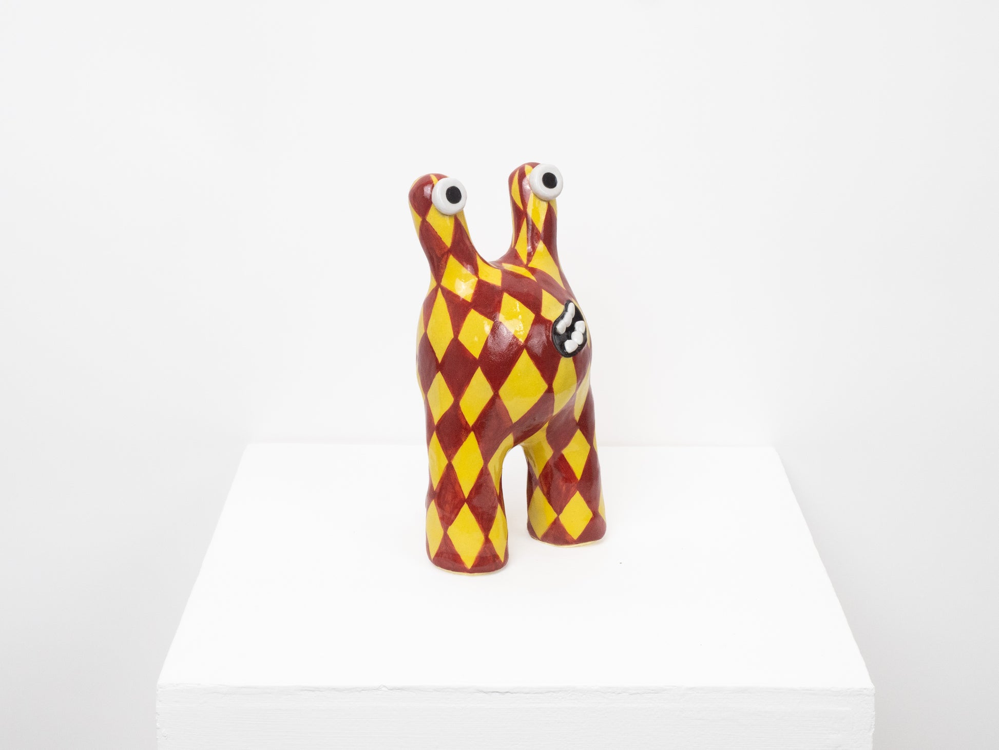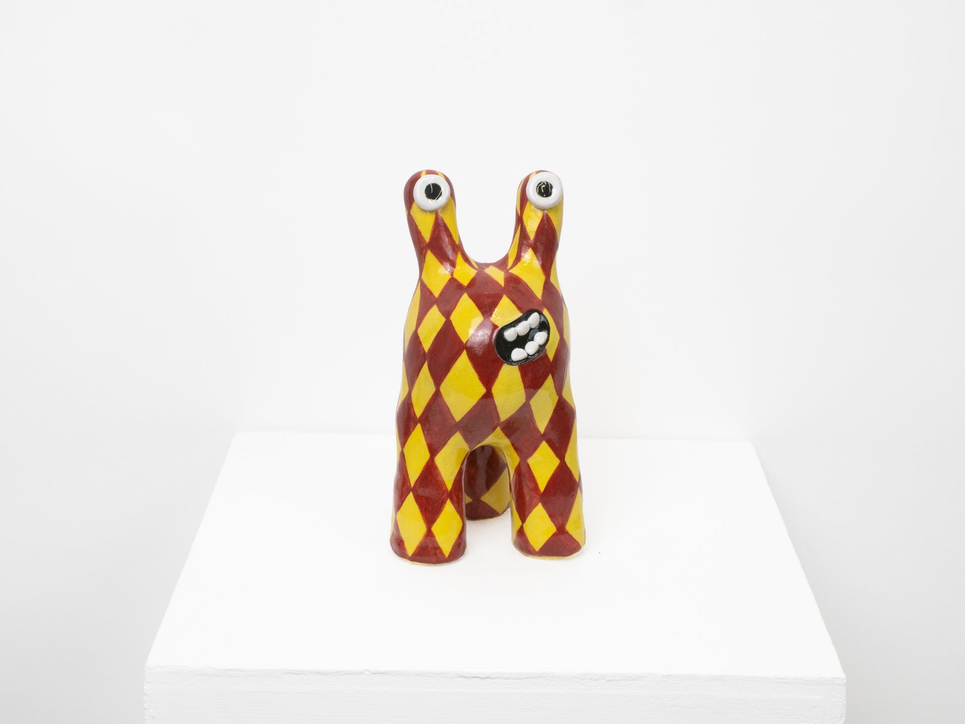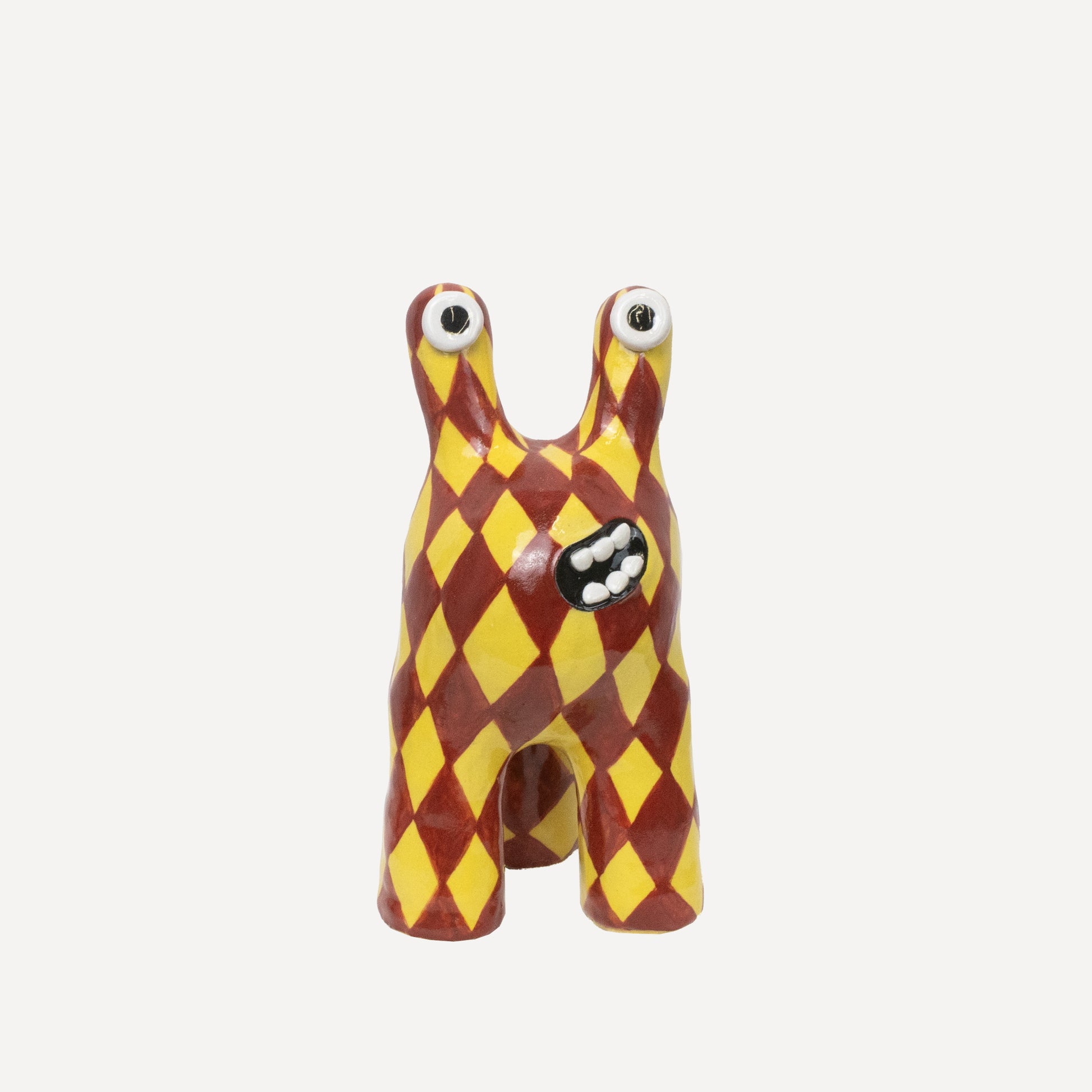'Tully' is one of our most classic monster designs. Its humorous and upbeat energy brings joy to any room. This 'Tully' monster has been decorated with a yellow and maroon diamond pattern.
