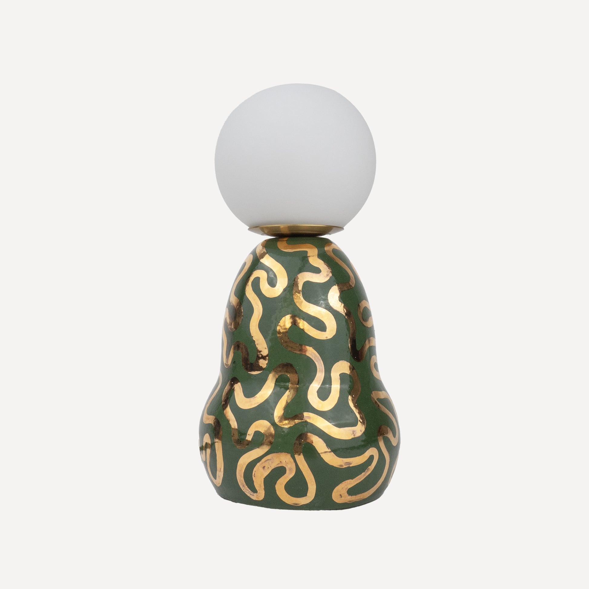 This base boasts a rich dark green glaze, contrasted by a playful, gold wiggly pattern that wraps around it, adding a touch of elegance and whimsy. The combination of the soft, translucent glass shade and the bold, artistic base creates a perfect balance of modern sophistication and unique design.