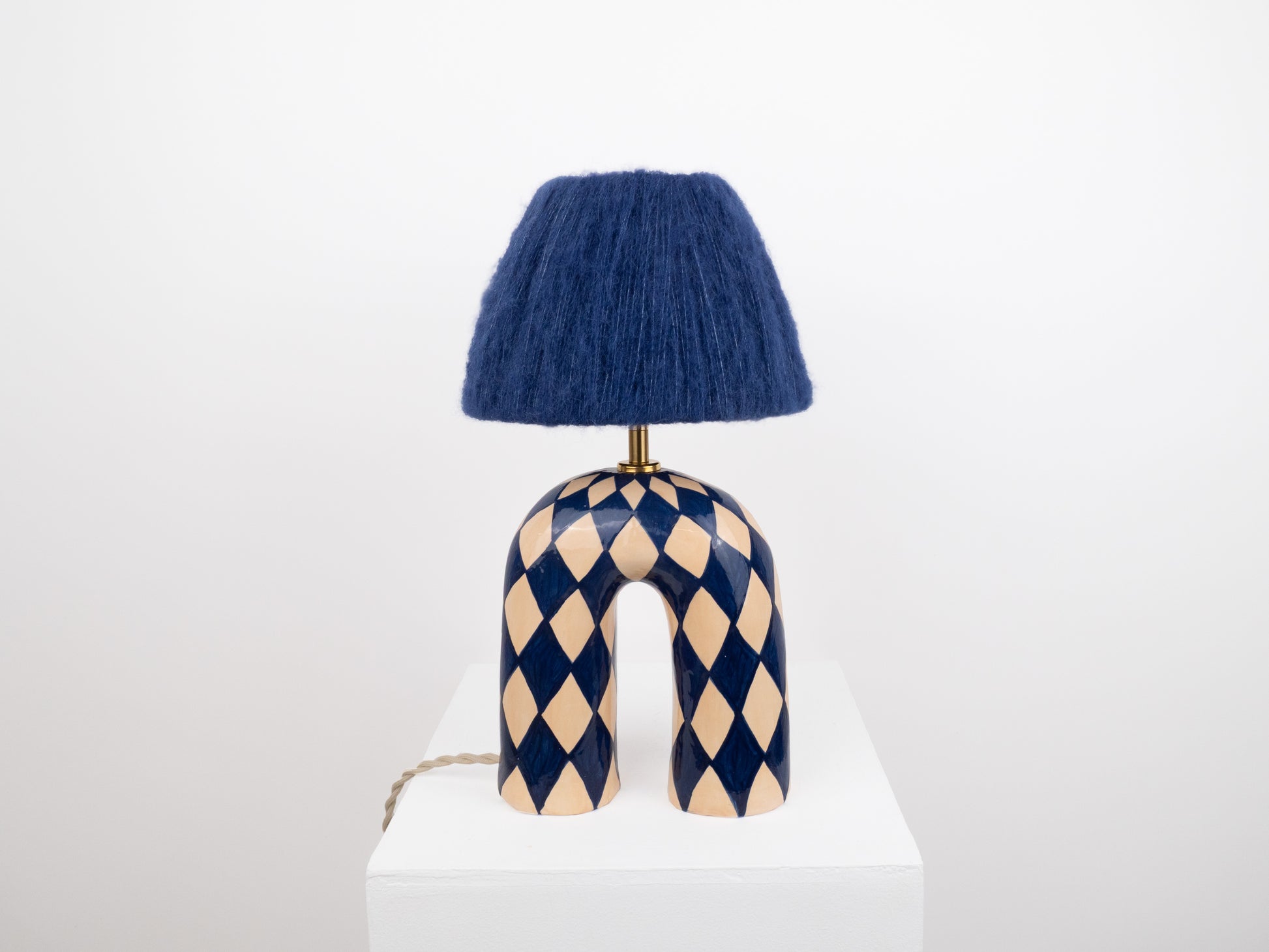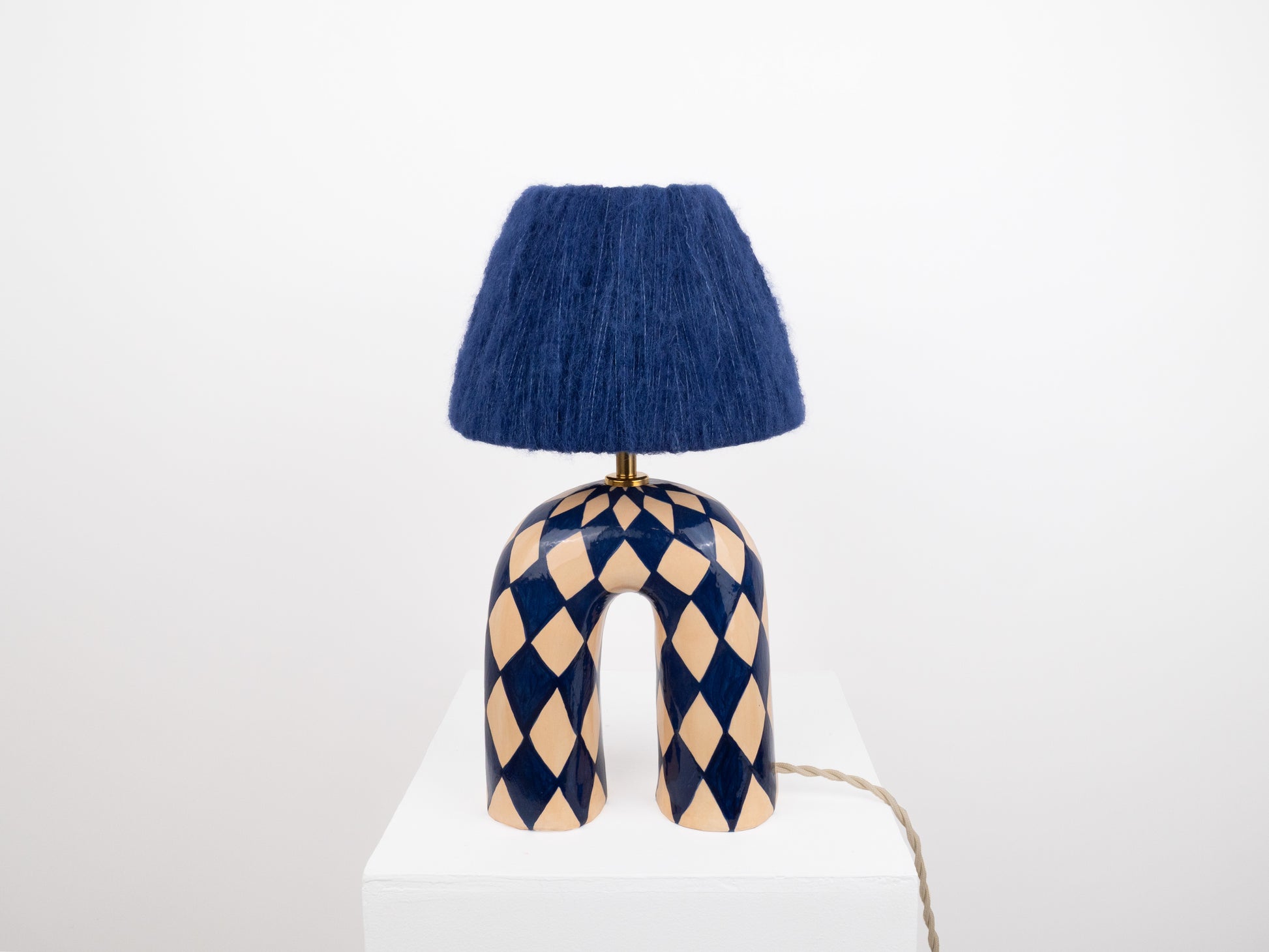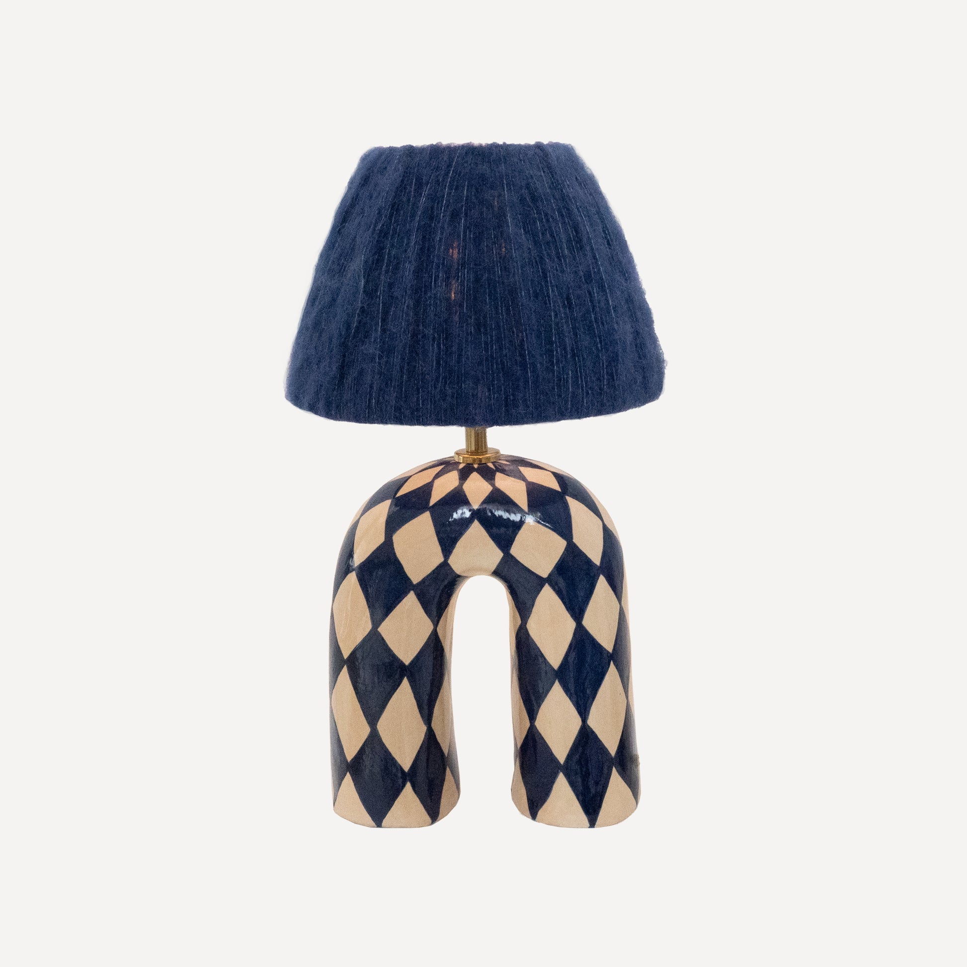 A bold yet elegant statement piece for your space. This handmade ceramic lamp features an arched base hand-painted in a deep navy and cream diamond pattern, finished with a high-gloss glaze that catches the light beautifully. It's paired with our signature wool lampshade in rich dark blue—a soft contrast to the polished surface below.