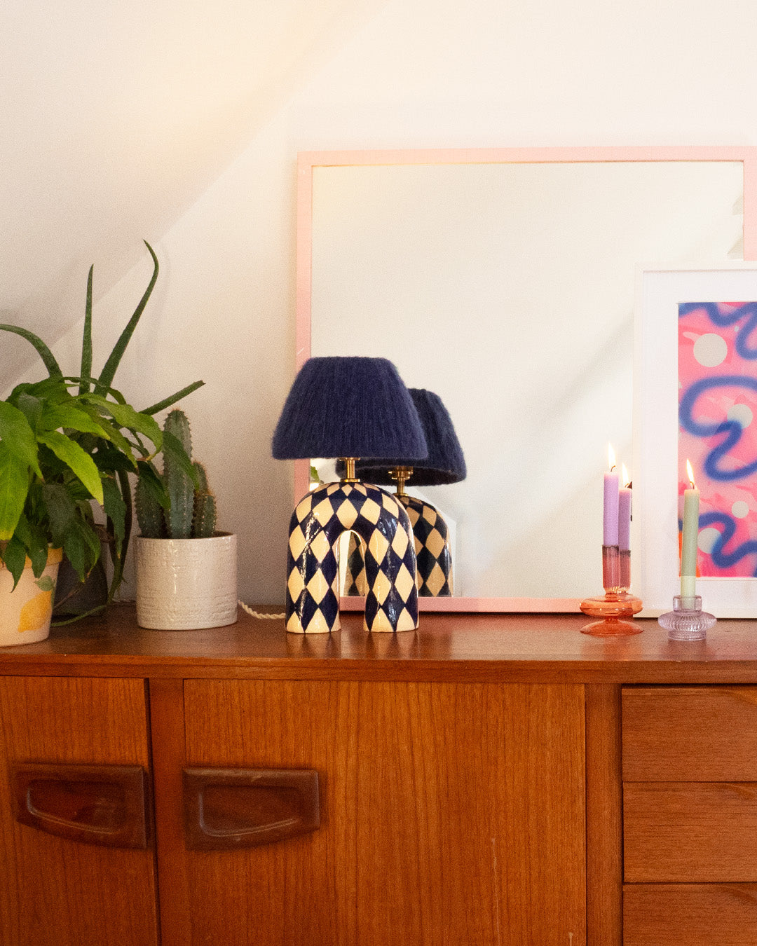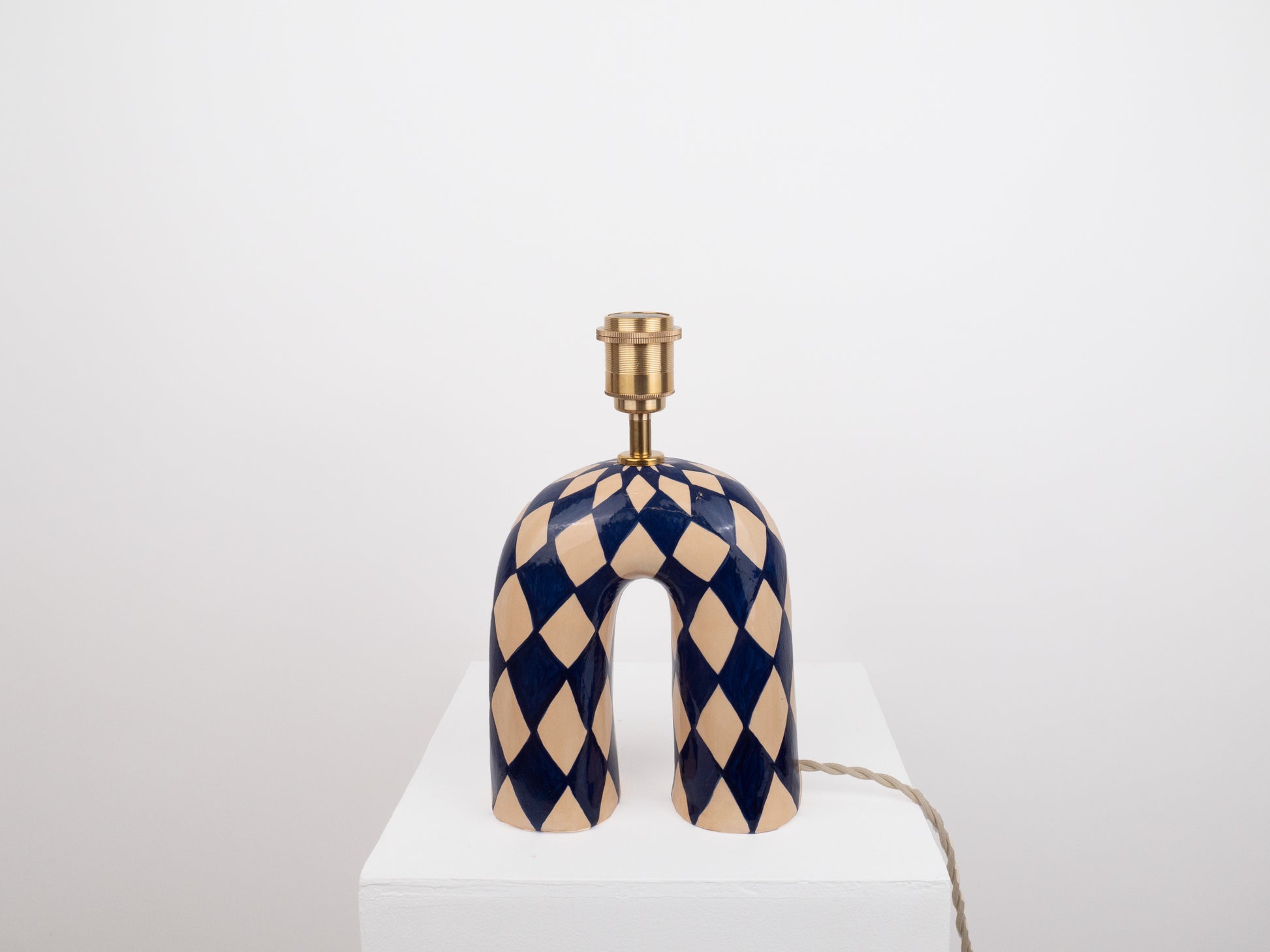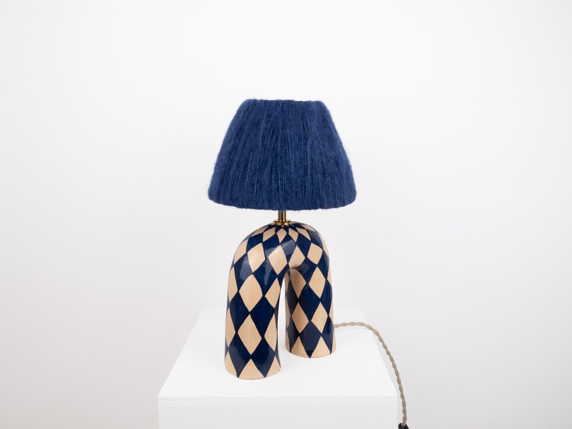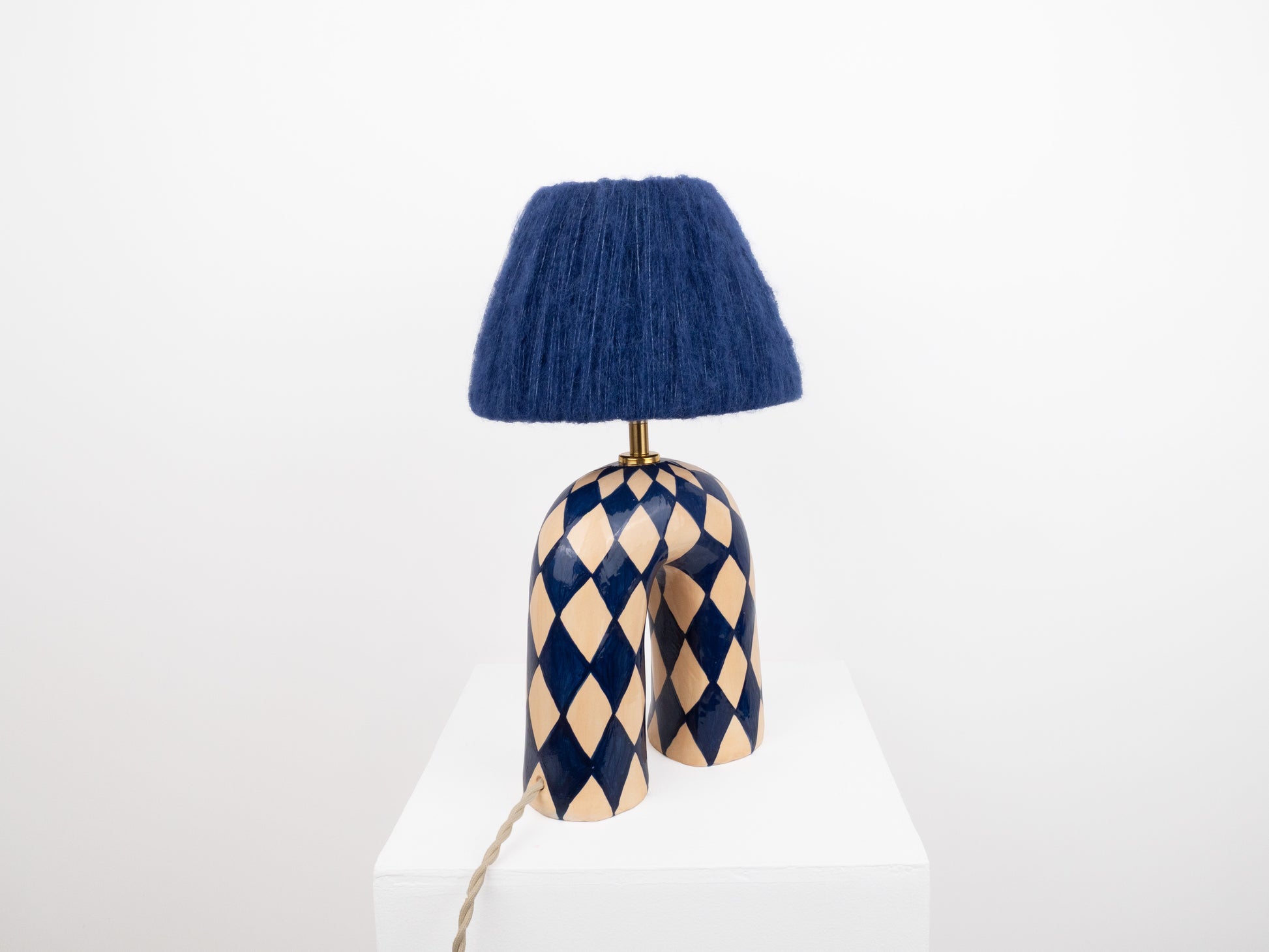 A bold yet elegant statement piece for your space. This handmade ceramic lamp features an arched base hand-painted in a deep navy and cream diamond pattern, finished with a high-gloss glaze that catches the light beautifully. It's paired with our signature wool lampshade in rich dark blue—a soft contrast to the polished surface below.