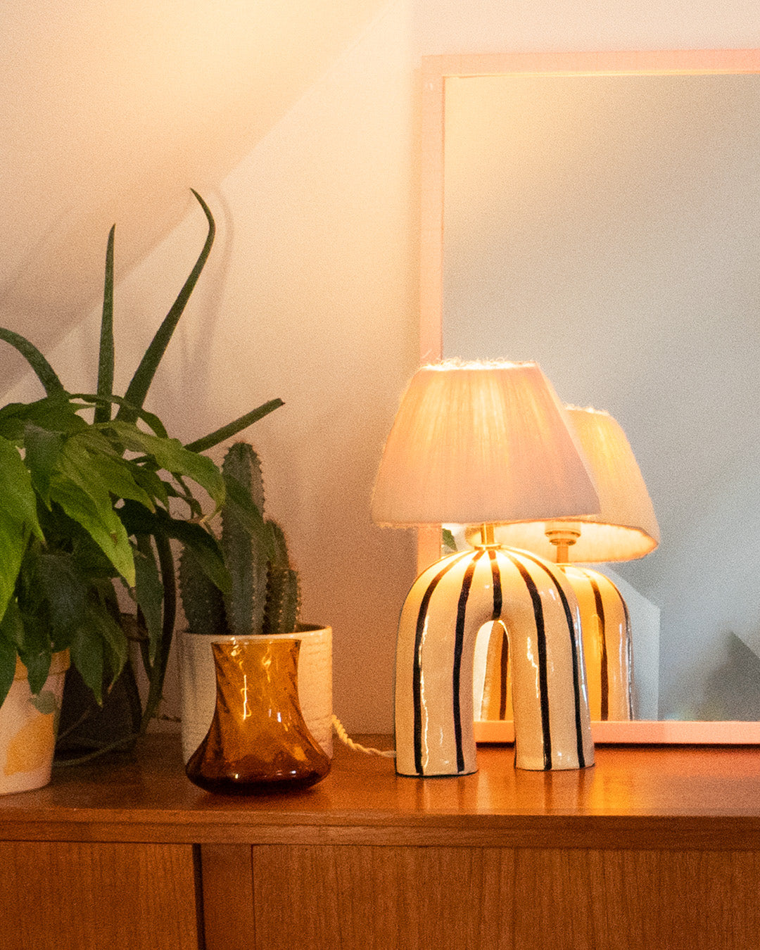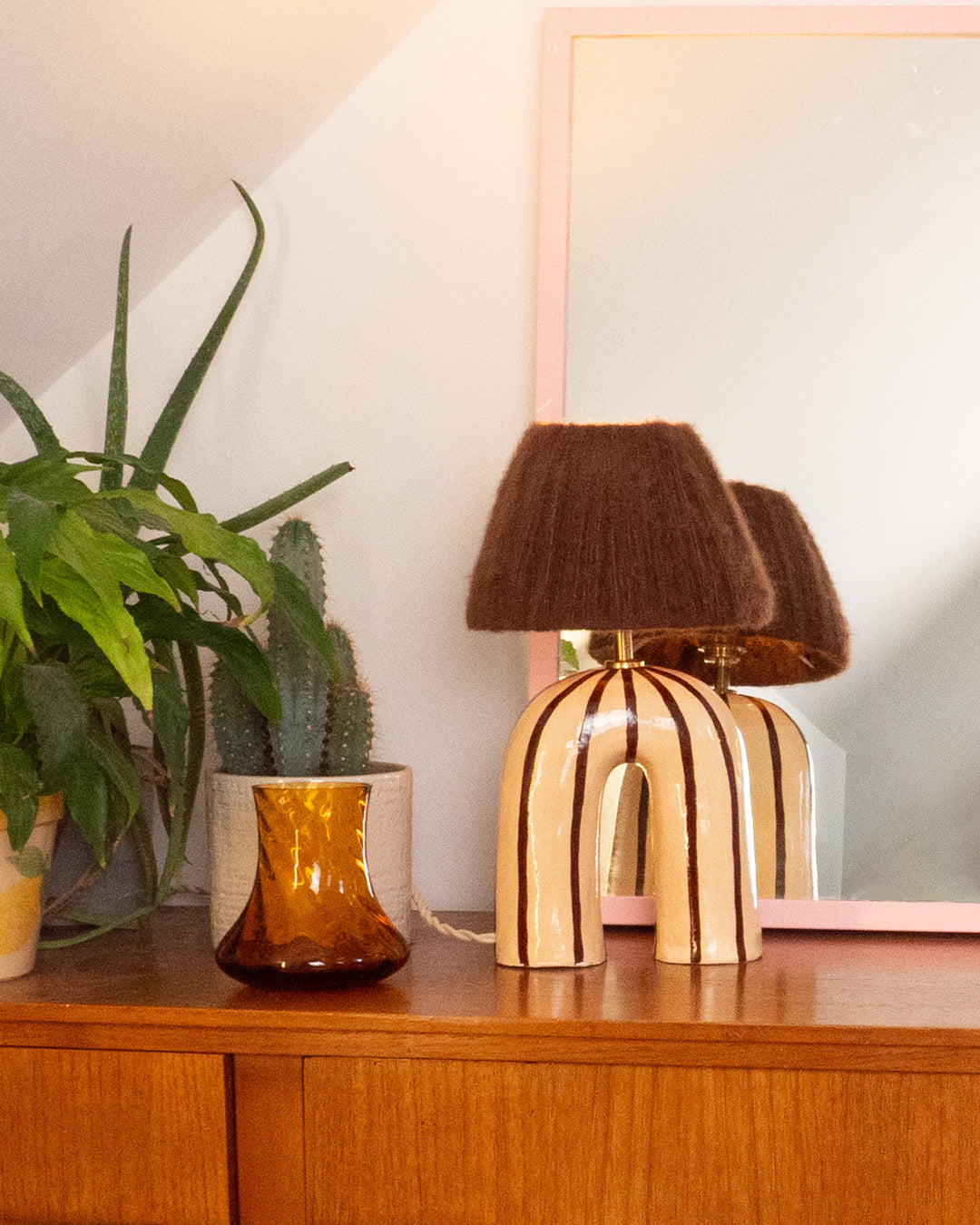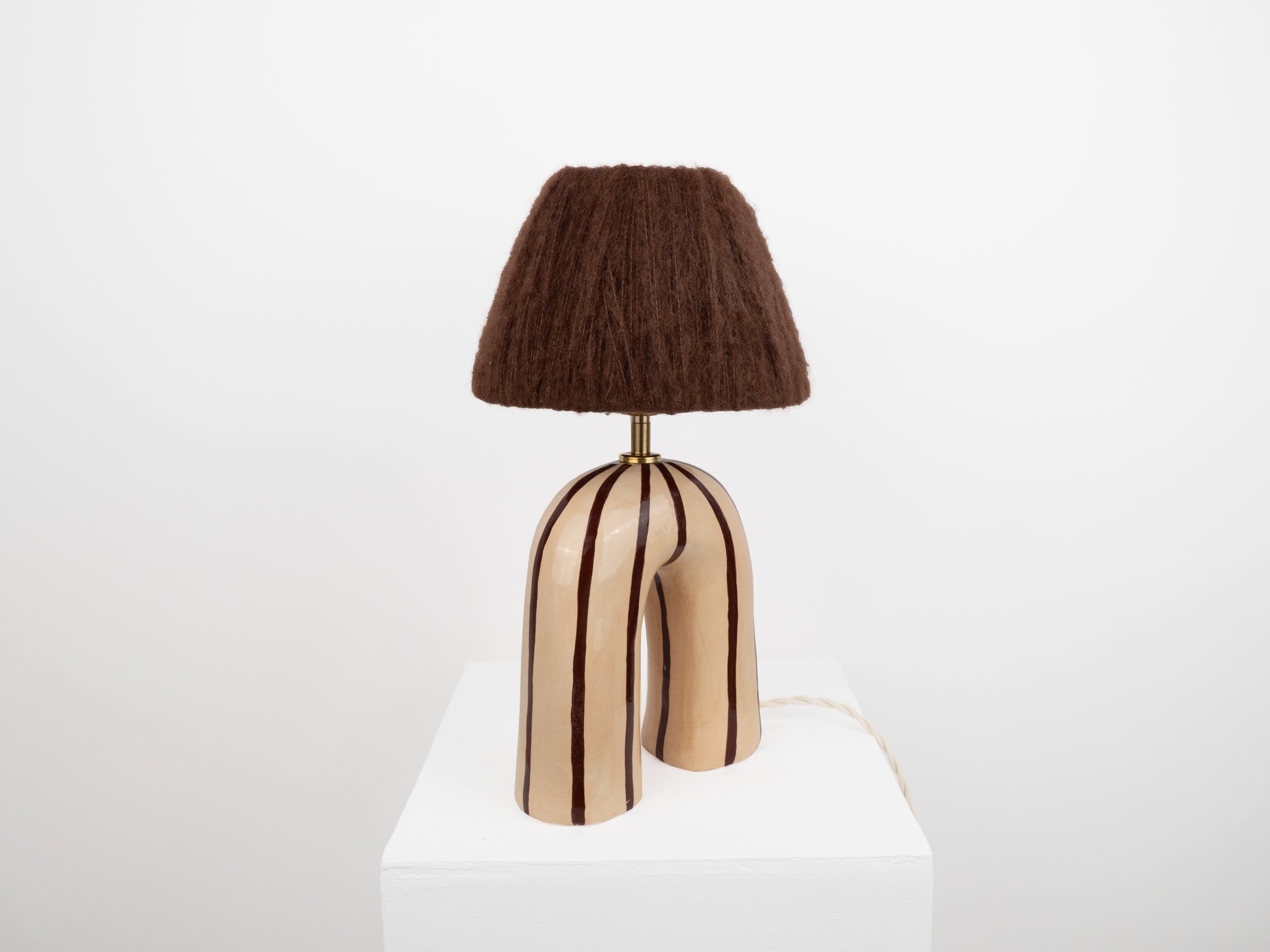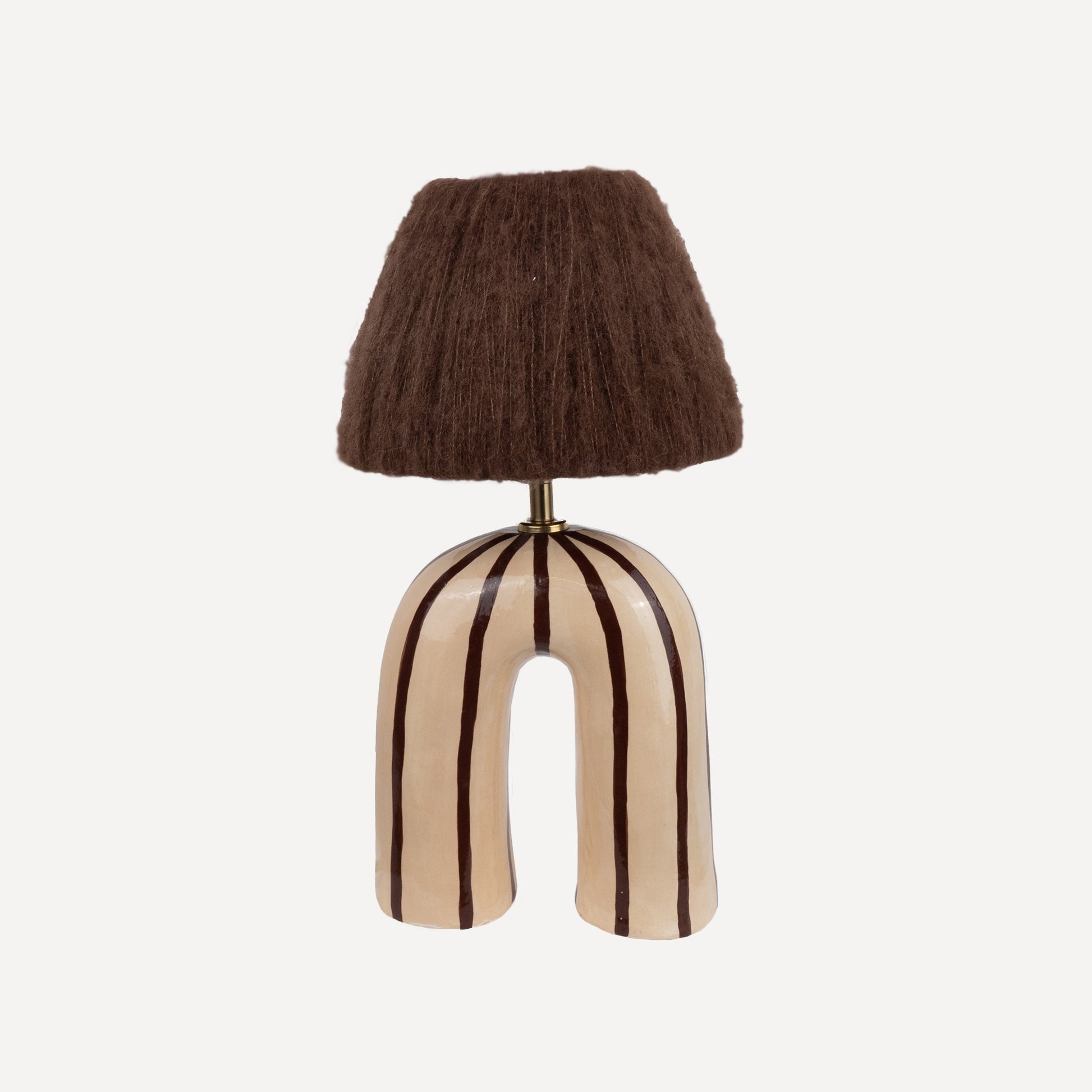 This handmade ceramic lamp features an arched base hand-painted with cream and brown stripes. Finished with a high-gloss glaze that catches the light beautifully. It's paired with our signature wool lampshade in rich brown colour a soft contrast to the polished surface below.