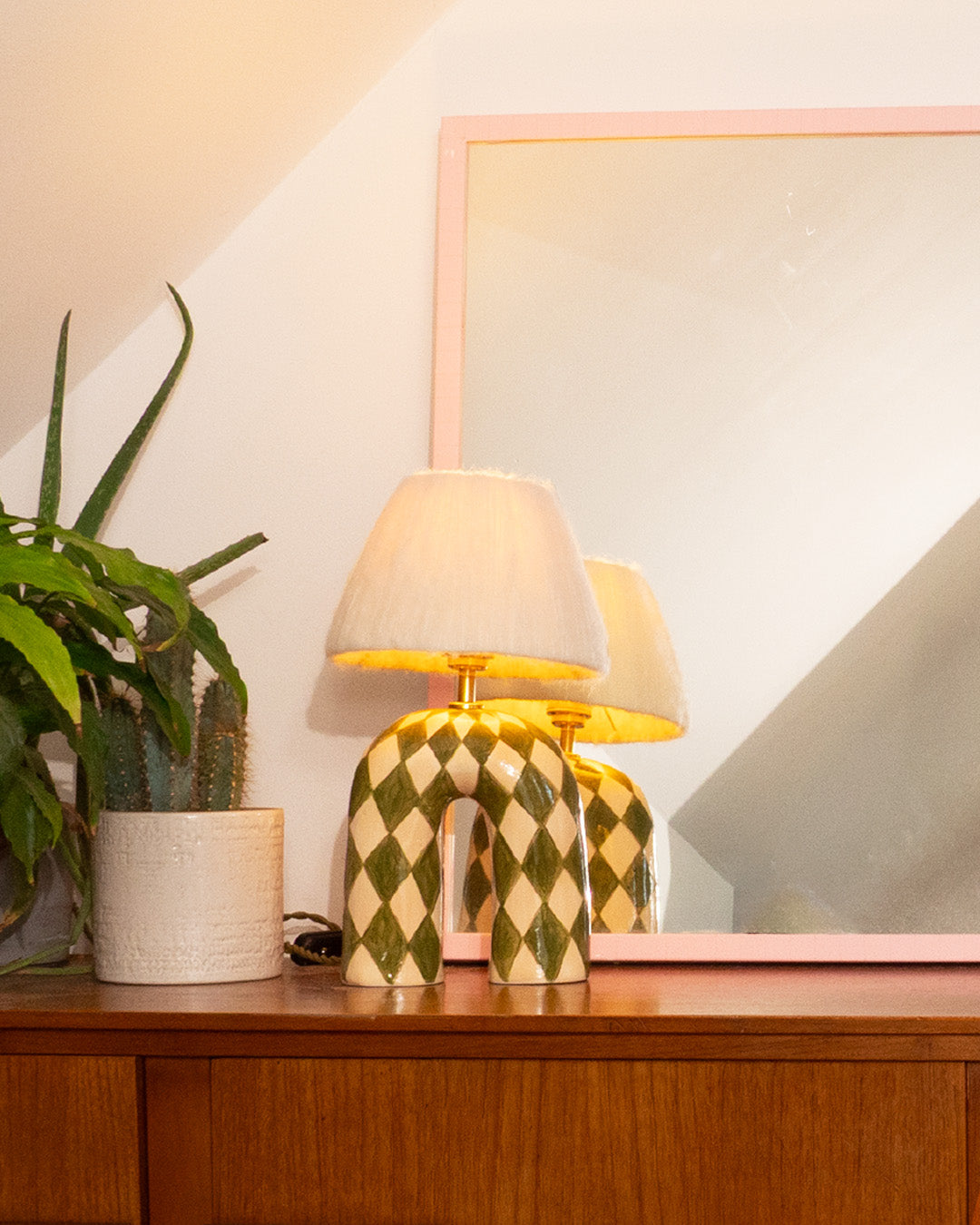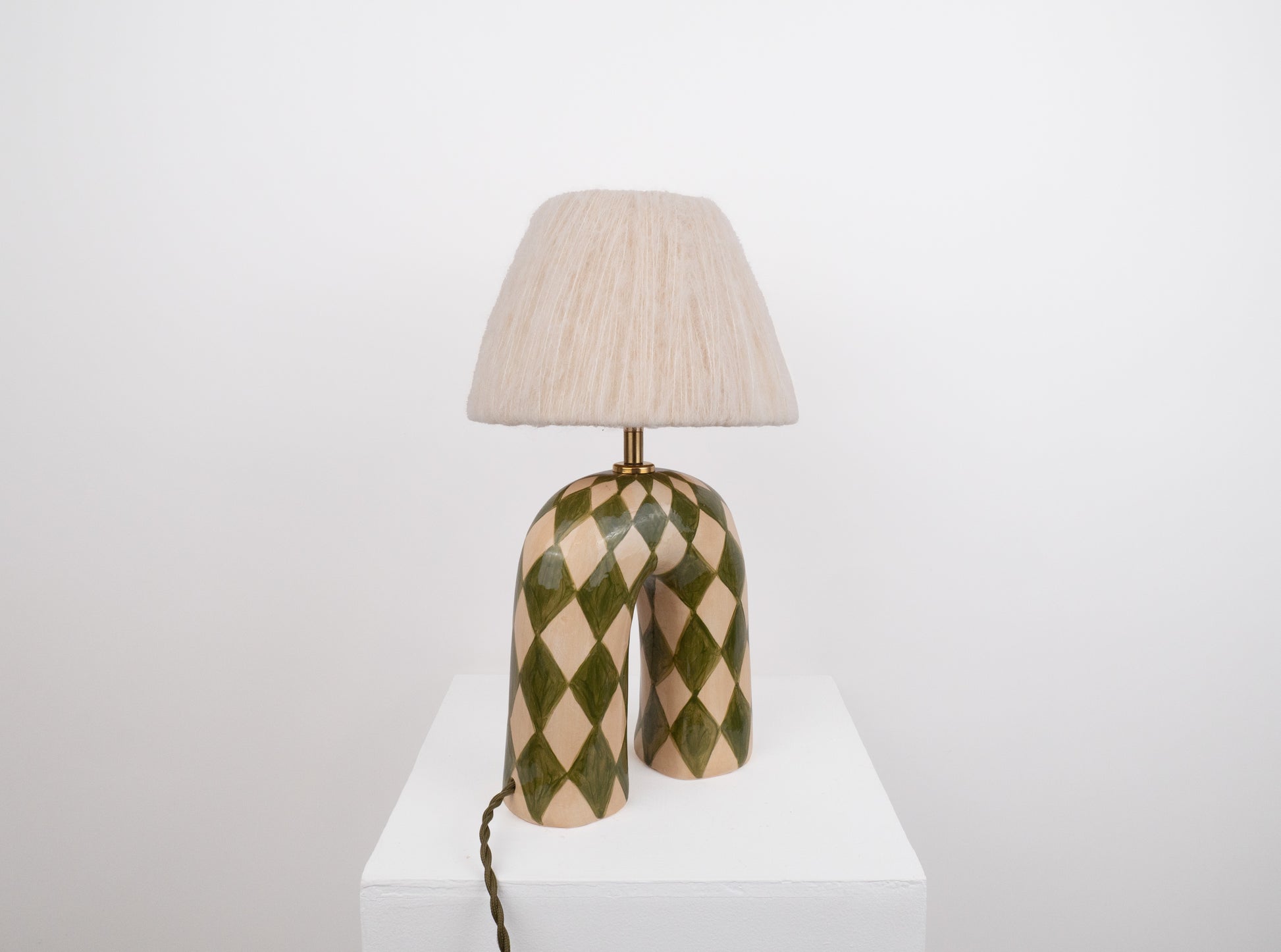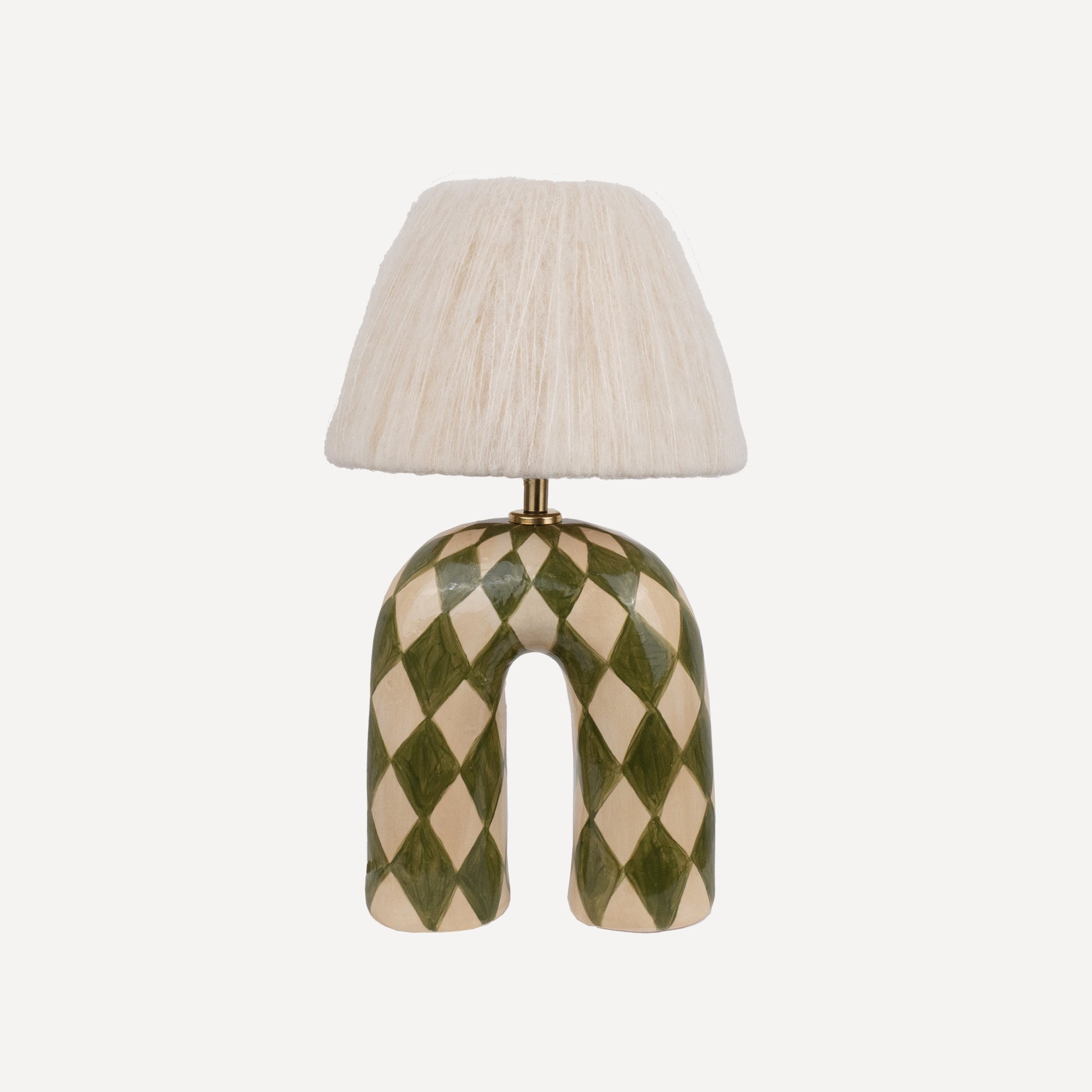 A bold yet elegant statement piece for your space. This handmade ceramic lamp features an arched base hand-painted in a mossy green and cream diamond pattern, finished with a high-gloss glaze that catches the light beautifully. It's paired with our signature wool lampshade in cream, a soft contrast to the polished surface below.