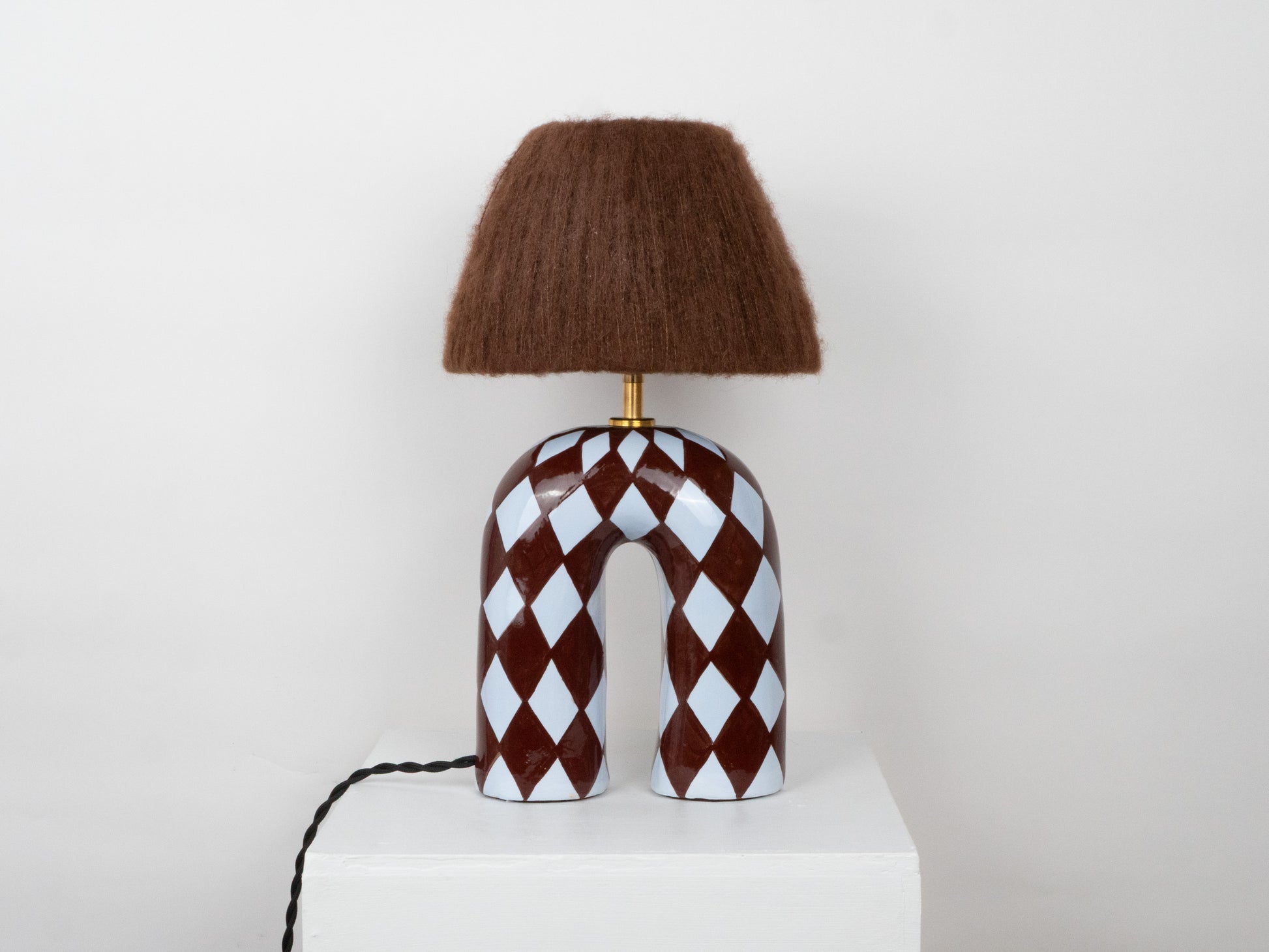 A bold yet elegant statement piece for your space. This handmade ceramic lamp features an arched base hand-painted in a blue and brown diamond pattern. Finished with a high-gloss glaze that catches the light beautifully. It's paired with either a blue or brown lampshade.